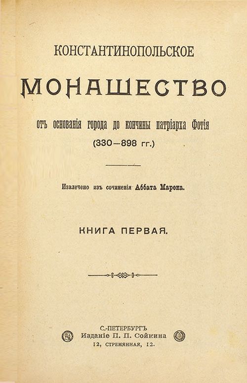 Вскоре книга вышла на русском языке в столичном издательстве Петра Петровича Сойкина. В конце 1898 года исследование увидело свет как приложение к журналу «Русский паломник», а в начале 1899 года Сойкин выпустил отдельное издание в 2 книгах в одном переплете: Константинопольское монашество от основания города до кончины патриарха Фотия. (330-898 гг.) / извлечено из сочинений аббата Марена. [В 2 кн.] Кн. 1-2. СПб.: Издание П.П. Сойкина, [1899]. Кн. 1: 164 с. Кн. 2: 176 с. (Книга 1: Монастыри. Монахи и религиозная жизнь. Монахи и духовная власть. Книга 2: Монахи и императорская власть. Умственная деятельность Константинопольских монахов).