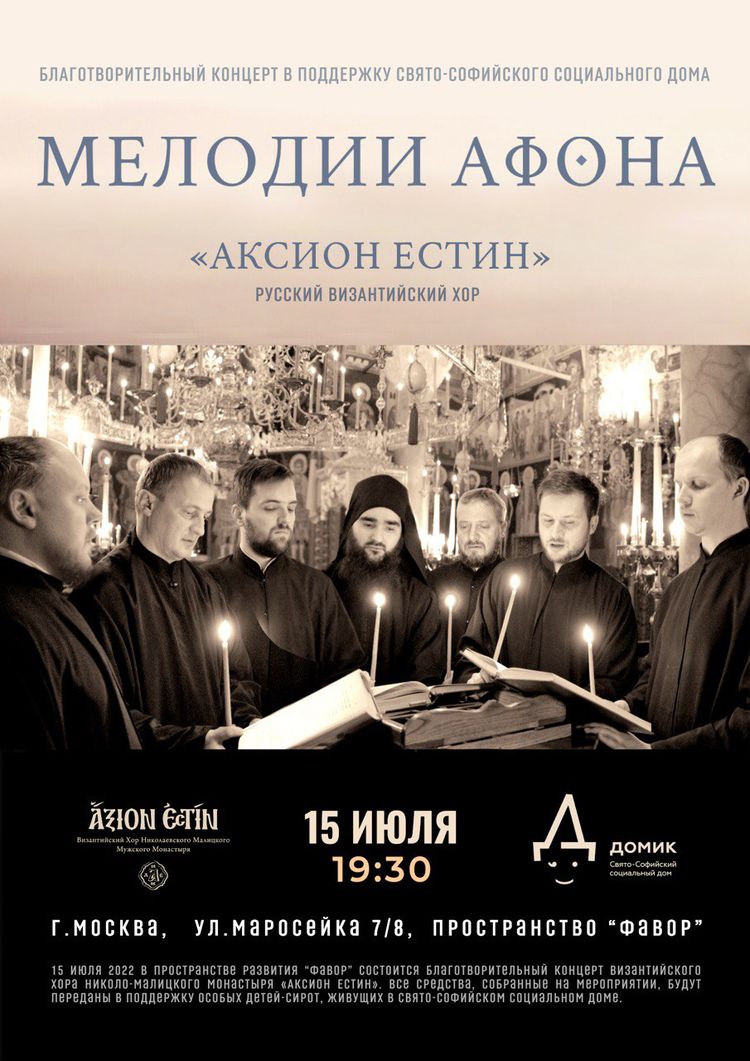 15 июля в пространстве развития «Фавор» состоится благотворительный концерт византийского хора Николо-Малицкого мужского монастыря «Аксион Естин», средства от которого пойдут на поддержку особых детей-сирот, живущих в Свято-Софийском социальном доме.