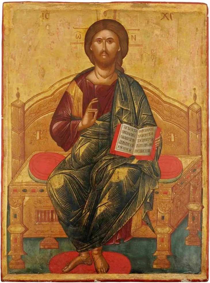 Изображение Иисуса Христа, относящееся к иконографическому типу «Спас на престоле» (то есть показывающее Христа сидящим на троне в полный рост), было одним из ценных предметов, похищенных мародерами из церкви Антифонитиса сразу после турецкого вторжения 1974 года. В 2014 году икону выставили на аукцион в Цюрихе. Фотографию образа в онлайн-каталоге аукциона случайно увидел директор музея Киккского монастыря Стилианос Пердиккис. Он и сообщил о своей находке в Архиепископию и в полицию. Правоохранительные органы совместно с Генеральным прокурором связалась с организаторами – аукционным домом Schuler Auktionen. Представителям церкви удалось собрать досье, подтверждающее происхождение иконы, и согласовать его со всеми компетентными инстанциями, включая посольство Швейцарии на Кипре. Благодаря этому икону получилось снять с торгов. Однако вернуться на Кипр образ смог только в этом году.