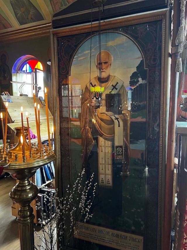 Справа от иконостаса стоит киот с иконой вмч. Пантелеимона, написанный в 1898 году в Свято-Пантелеимоновском монастыре на Афоне специально для этого храма, слева — большой образ свт. Николая Чудотворца, сооруженный в 1949 в честь десятилетия эмигрантской общины. Напротив — киот с иконой Владимирской Божией Матери, от которой в 1891 в Москве произошло чудо с монахиней Митрофанией.