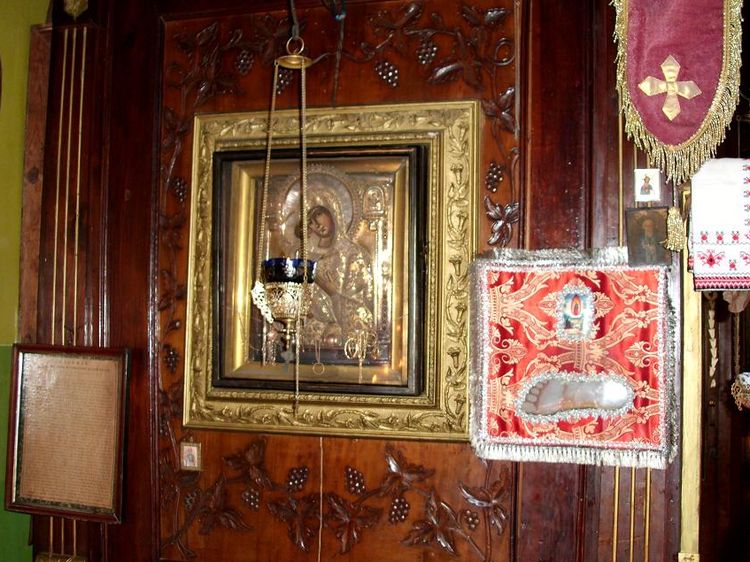 По преданию, икону Божией Матери "Владимирская" подарила храму монахиня из России, насельница Вознесенского женского монастыря Митрофания. В 1879 году, отправляясь поклониться Гробу Господню, она остановилась на Пантелеймоновском подворье. Икону, с которой она никогда не расставалась, – таково было родительское благословение, – она разрешила временно разместить в здешней церкви, поскольку в недавно основанном храме было еще мало образов, монахи уговорили Митрофанию оставить свою икону хотя бы на время путешествия. Монахиня согласилась, но очень тосковала по иконе. Через девять лет она отправилась на Синай, и по пути в Россию все ж таки забрала свою икону с собой. Однако вскоре по возвращении домой она тяжело заболела: ее лицо начало буквально «гнить заживо». Доктора не находили средств, чтобы ее вылечить и сулили ей скорую кончину. На праздник Успения Божией Матери Митрофания закутала свое лицо и пошла в Успенский Собор, где горько плакала и просила помощи у Богородицы. Неожиданно к ней подошла незнакомая женщина, спросила: «Вы из Константинополя икону взяли?» и приказала вернуть образ в храм Пантелеймоновского подворья. Женщина тут же отошла и исчезла. Сколько ни искала ее монахиня, найти не могла. Но запомнила слова незнакомки: «Верни икону на место, и ты поправишься». Как только Митрофания подготовила икону к отправке в Константинополь, ее болезнь прекратилась. Прожив длинную жизнь, матушка Митрофания больше никогда не болела. А икона и по сей день хранится в подворье... Это предание, записанное в 1891 году в Москве самой Митрофанией, в рамке под стеклом установлено рядом с иконой.
