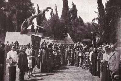 Проводив патриарха и гостей, начальник Миссии, иногда и генеральный консул, управляющий подворьями Императорского Палестинского Общества и служащие в этих учреждениях в колясках, заранее заказанных, по прекрасной шоссейной дороге отправляются в Хеврон, обгоняя по пути и толпы богомольцев, направляющихся туда же, и одиночные небольшие группы, и специальный троицкий караван, идущий под руководством каваса Палестинского Общества. Русские постройки в Иерусалиме на два дня остаются безлюдными: жизнь в них как бы замирает.