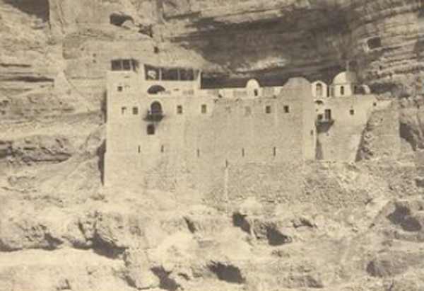 [12]Монастырь этот находится на средине подъема на гору Сорокадневную и к нему ведет довольно крутая лестница, по которой с половины ее можно добираться только пешком. В пещере устроен храм и жилища иноков. Еще болеe трудный и даже опасный путь предстоит для тех, кто пожелает побывать на самой вершине Сорокадневной горы, откуда открывается очаровательный вид на Иорданскую долину, Мертвое море, Аммонитские и Моавитские горы.