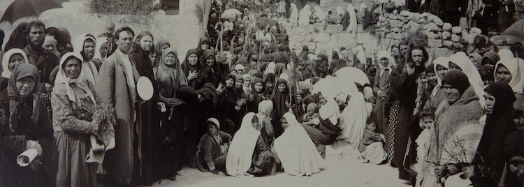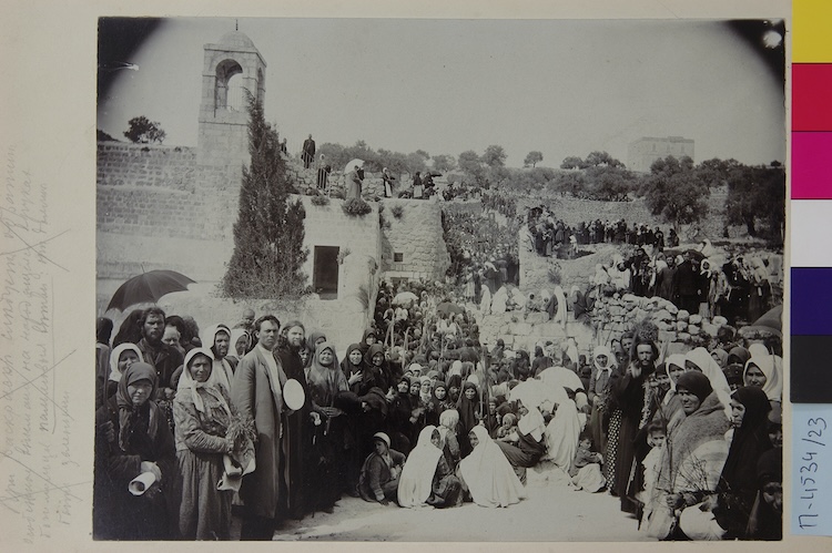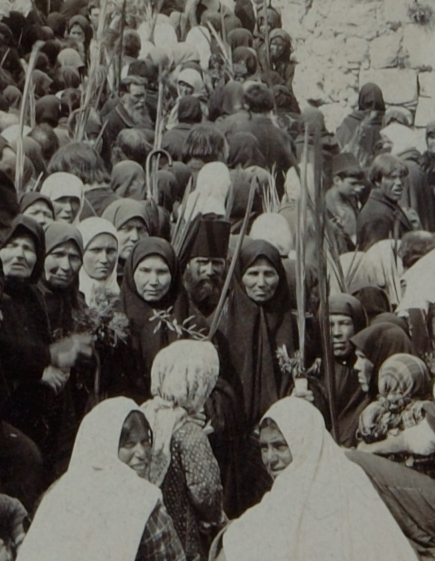 В центре ближайшей группы паломников — священник Русской Духовной Миссии. На дальнем плане видны русские хоругви. У всех паломников из России в руках веточки пальмы, которые потом они увезут с собой на родину. Снимок сделан в Виффагии, где, согласно евангельскому рассказу, Спаситель сел на ослика, чтобы въехать в Иерусалим.