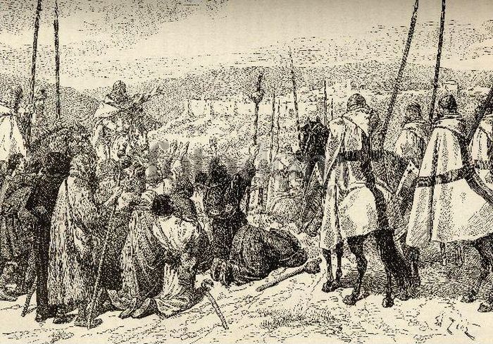 В Страстной четверг 1065 года эта перспектива стала весьма реальной для паломников: они были уже в непосредственной близости от Иерусалима, когда откуда ни возьмись появилась конная турецкая армия и вмиг окружила их. Турки, внезапно возникающие из клубов пыли, быстро перемещались на своих скакунах, осыпали паломников стрелами и издавали жуткие демонические крики, от которых кровь стыла в жилах. Несчастные немцы оказались совершенно не подготовленными к такому повороту событий. Многие их них были безоружными, да и воины, приблизившись к Иерусалиму за три дня до возможного конца света, отложили свое оружие подальше.