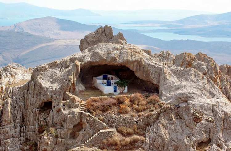 На вершине  горы на острове  Лемнос находится  эта  живописная церквушка, которая является уникальной в мире по своей архитектуре. Она расположена в пещере  и не имеет крыши.