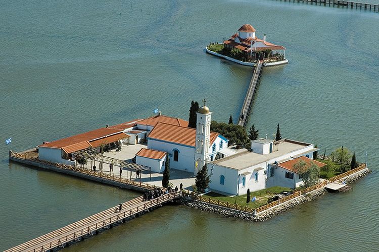 На одном из островков расположен монастырь Святого Николая, на втором - церковь Панагии Пантанасса, где находится список чудотворного образа Божией Матери Пантанассы (Всецарицы), хранящегося в Ватопедском монастыре. Поклониться списку и попросить об исцелении приходят многие больные и их семьи. Список, как и чудотворная икона, дарит исцеления, особенно от онкологических заболеваний.