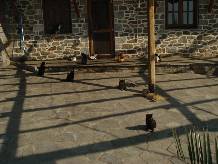 Интересно, как ведут себя прирученные животные. К обеду у кухни собираются во множестве знаменитые афонские коты. Терпеливо ожидая, они знают, что получат свою трапезу. А во время вечерней службы монастырский пес – уж очень он добрый — ложится у двери храма, будто для того, чтобы послушать пение и чтение.