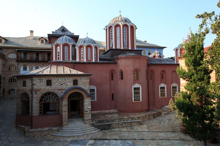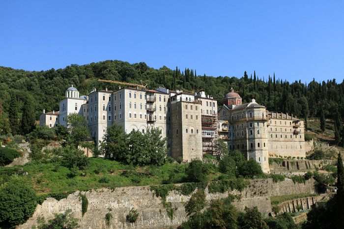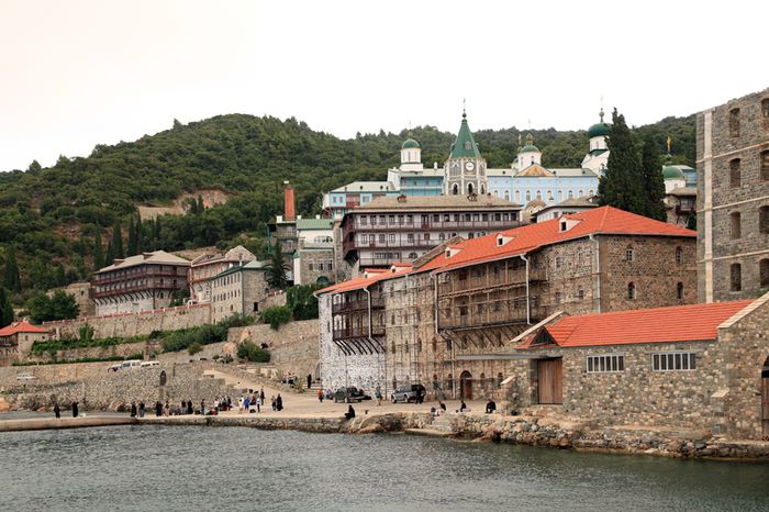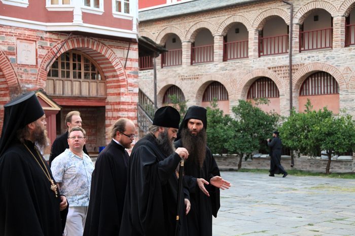 Вечером члены делегации прибыли в Русский Свято-Пантелеимонов монастырь, где были встречены братией обители и молились за уставным богослужением.