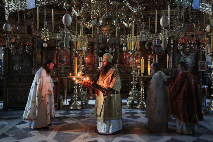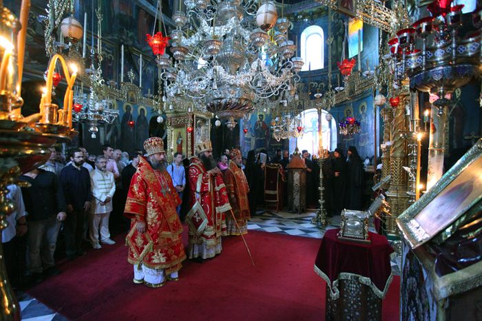 Утром 6 августа в болгарском монастыре Зограф члены делегации молились за уставным богослужением в соборном храме в честь святого великомученика Георгия Победоносца. Его Высокопреосвященство возглавил Божественную литургию в сослужении настоятеля монастыря игумена Амвросия и братии обители.