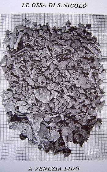 [5] По мнению профессора Мартино это есть та часть мощей, которую не взяли с собой барийцы. Матрос Маттео вошедший во святой гроб, чтобы похитить святыню, буквально растоптал хрупкие кости святителя, находившиеся на дне раки, когда забирал более крупные из мощей. Именно поэтому мощи сильно раздроблены.