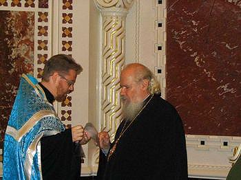 Свящ. Алексий Ястребов передает в дар Святейшему Патриарху Алексию часть мощей Святителя Николая