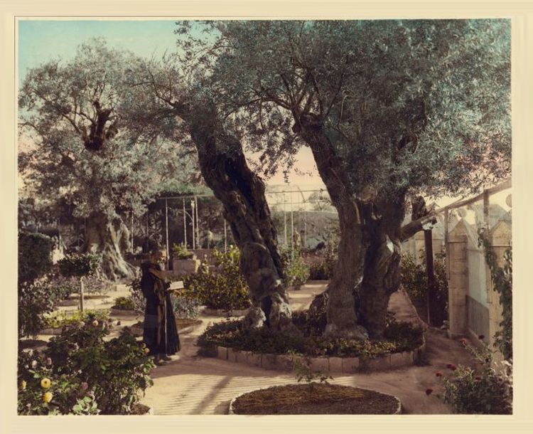 «Направо находится тщательно огороженный каменной стеной Гефсиманский сад. Он принадлежит ныне латинянам. В нем находится 8 древних масличных дерев, отростки древних, которые были зрителями ночной молитвы Богочеловека. Посетив сад, невольно перенесся я мыслью к тому времени, когда здесь в тиши темной ночи, после Тайной Вечери проходил Божественный Учитель и возносил Свои пламенные молитвы до кровавого пота»5.
