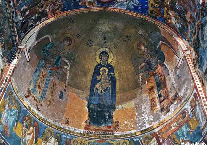 Живопись дошла до нас в достаточно хорошем состоянии. В конхе апсиды помещено изображение Богоматери в полный рост, держащей перед собой Младенца в мандорле. Композиция фланкирована изображениями святых Петра и Павла. Бема занята изображением Вознесения Господня, ниже расположен пророческий ряд (пять фигур), под ним — святительский. Под окном — тело Христа в пеленах в гробу, на северной стене алтаря Сошествие во ад, на южной —Мироносицы у гроба.