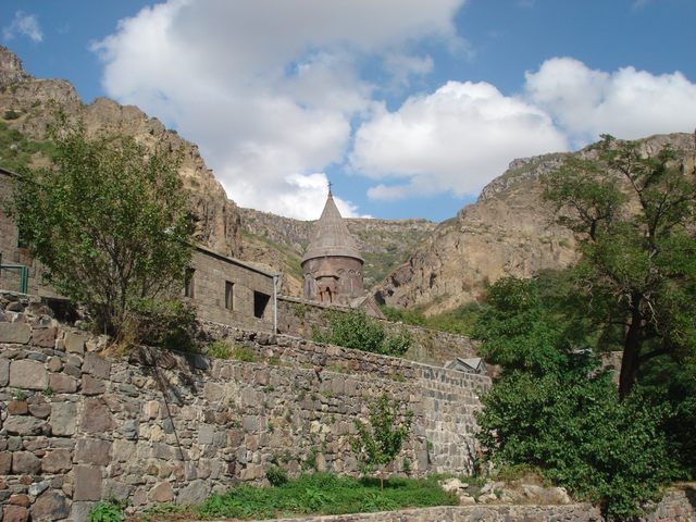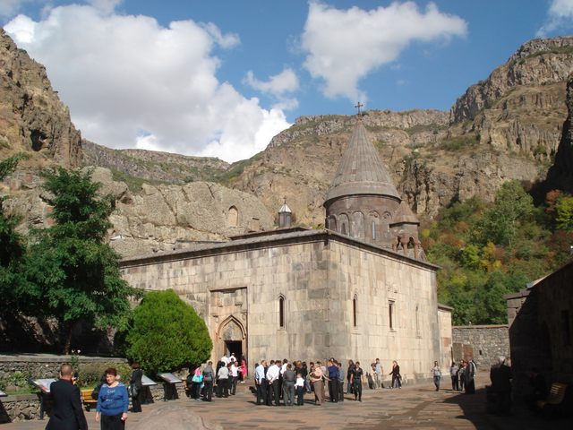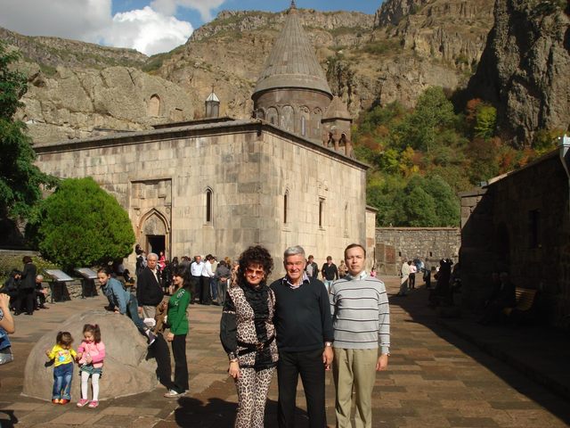 Монастырь Гегард или Гегардаванк (в древности Айриванк) расположен в ущелье среди высоких гор, на правом берегу реки Азат. Бог соединил здесь в единое целое человека, монастырь и природу. Монастырь был назван Гегард в XII–XIII вв., потому что здесь много лет хранилось копье сотника Лонгина (гегард – копье на древнеармянском). Всемирную славу Гегарду принесли пещерная церковь, усыпальница князей Прошянов, усыпальница-притвор Папака и его супруги Рузухан. В монастыре очень сурово из-за аскетической природы, соединившейся с причудливым зодчеством. Здесь мы видели многочисленные естественные и высеченные пещеры, хачкары и кельи, в которых когда-то подвизались древние христианские подвижники.