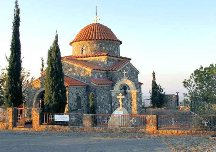 У основания темно-бурой скалы на специально устроенной площадке паломники оставляют машины и проходят в маленькую современную крестово-купольную часовню, освященную в честь Всех святых, на Кипре просиявших.