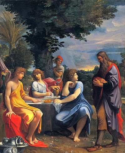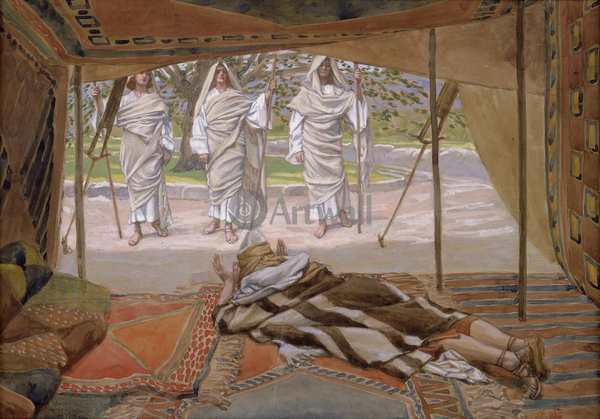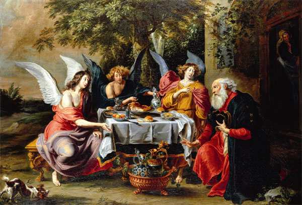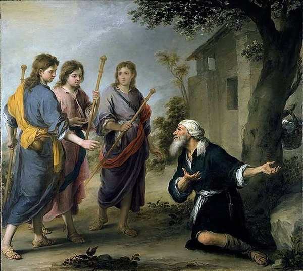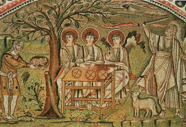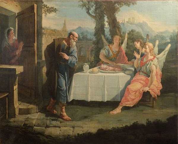 Согласно ветхозаветному тексту, Авраам, расставшись с Лотом, поселился у дубрав Мамре в Хевроне, где воздвиг жертвенник. Именно там к нему явились три ангела. «И явился ему Господь у дубравы Мамре, когда он сидел при входе в шатер (свой), во время зноя дневного. Он возвел очи свои и взглянул, и вот, три мужа стоят против него. Увидев, он побежал навстречу им от входа в шатер (свой) и поклонился до земли, и сказал: Владыка! если я обрел благоволение пред очами Твоими, не пройди мимо раба Твоего; и принесут немного воды, и омоют ноги ваши; и отдохните под сим деревом» (Бытие 18:1-4). Во время этого посещения Авраам получил обещание, что у него родится сын.