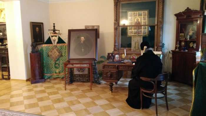 В Кабинете отца Иоанна патриарх Феодор приложился к главным святыням Квартиры — к наперсному Кресту отца Иоанна, его моленным иконам, прижизненному портрету.