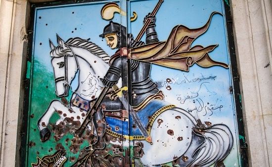 Святой Георгий на воротах церкви в Рас-аль-Айн на северо-востоке Сирии