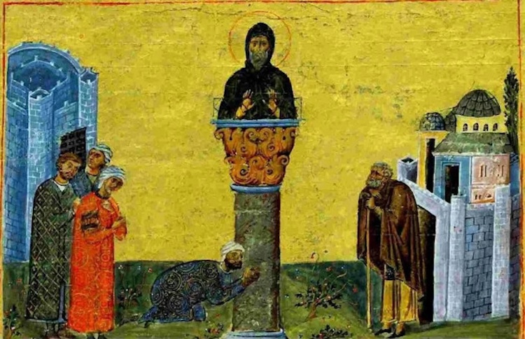 Симеон известен как первый святой, совершавший подвиг поста и молитвы на каменном столпе. Столп был твердо укреплен основанием в земле, а наверху имел небольшую площадку, где можно было стоять или сидеть. Высота каменной колонны, на которой подвизался отшельник, составляла около 15 метров. Феодорит, епископ Кирский, рассказывал о святом Симеоне, как тот, находясь на незащищенной от дождя и ветра площадке, проводил дни в непрестанной молитве, клал поклоны или долгое время стоял неподвижно с воздетыми руками. Сорок дней Великого поста Симеон обходился без еды и питья. При всем величии аскезы, подвижник обладал подлинным смирением. Когда отцы-пустынники, желая проверить его духовное состояние, повелели спуститься, Симеон был готов сделать это ради послушания старцам. И тогда они благословили отшельнику продолжать подвиг, который сочетал в себе и юродство, и мученичество. Святой Симеон скончался на столпе во время молитвы. Память его празднуется 14 сентября. Мощи святого Симеона Столпника по приказу императора Леона вскоре после кончины подвижника были перенесены сначала в Антиохию, а затем в Константинополь, в собор святой Софии.
