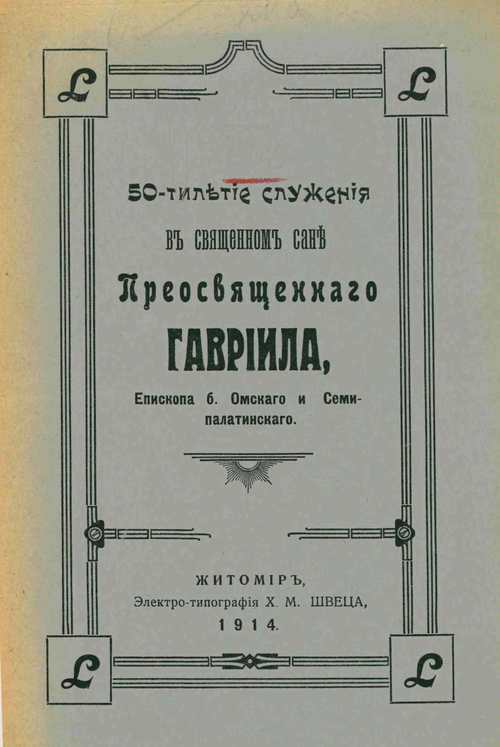 38. 50-летие служения в священном сане Преосвященного Гавриила, Епископа Омского и Семипалатинского. Житомир. 1914. С. 14.