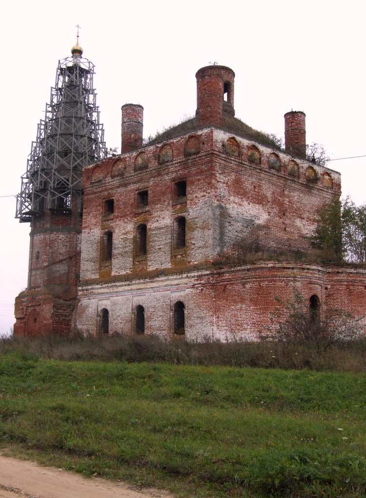 Местная пятиглавая, в связи с колокольнею, церковь построена в 1787 году усердием прихожан, с 4-мя приделами: 1) Успения Богородицы, 2) Свят. Николая, 3) Св. Иоанна воина и 4) Св. Леонтия Ростовского; а до нее были две деревянные церкви: одна во имя Св. Николая, а другая во имя С. Иоанна Воина, но когда они разрушены – неизвестно.