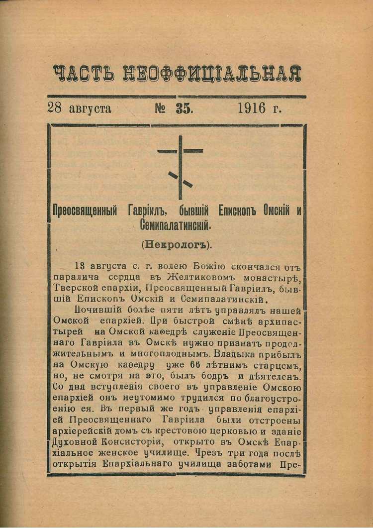 35. Преосвященный Гавриил (Голосов). Тверские епархиальные ведомости. 1916. № 35. 29 августа. С. 339.