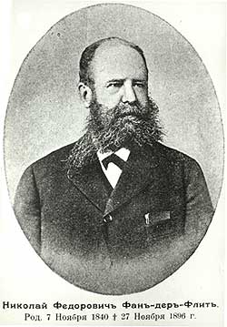 Ни родословная, ни биография состоятельного столичного финансиста Николая Фёдоровича Фан-дер-Флита не предвещали, что он станет псковским помещиком, выдающимся земским деятелем и щедрым благотворителем. Его предки, родственники и он сам занимались мореплаванием или финансами, а не сельским хозяйством. В середине XVIII века из Голландии в Архангельск перебрался его прапрадед, строитель кораблей Иван Фан-дер-Флит. Прадед Ефрем был начальником пограничной стражи и директором Кронштадтской таможни. Его дочь Александра Ефремовна вышла замуж за Иркутского губернатора Алексея Корнилова, и у них родился будущий вице-адмирал Владимир Корнилов – герой обороны Севастополя в Крымскую войну. Четыре сына Ефрема Ивановича окончили морской кадетский корпус, но трое из них погибли на море, а младший Тимофей Ефремович (1775-1843) перешёл на гражданскую службу. Он занимал разные должности в Костроме, Архангельске, Онеге, Петрозаводске (там был Олонецким губернатором) и с 1828 года управлял в столице Государственной экспедицией по проверке счетов. Там он приобрёл небольшой дом в Литейной части на углу Соляного переулка.