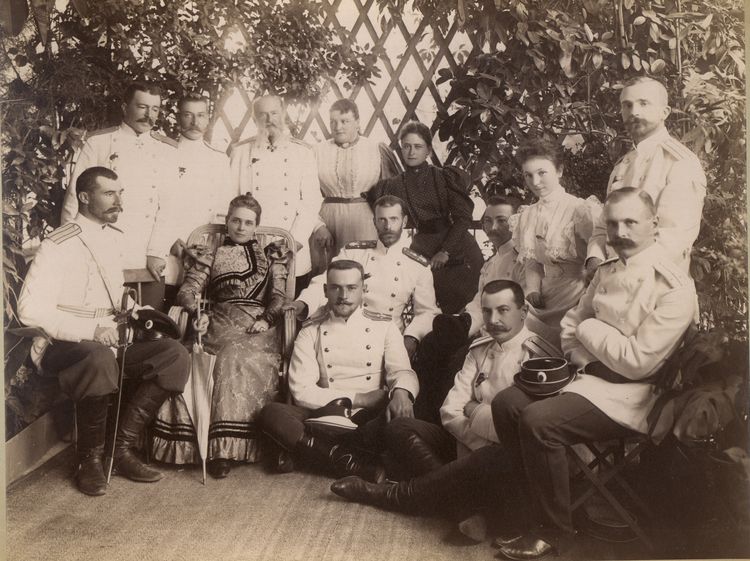 В Ильинском. Великий князь Сергей Александрович и великая княгиня Елизавета Федоровна в окружении лиц свиты. М.П. Степанов стоит второй слева.