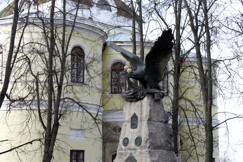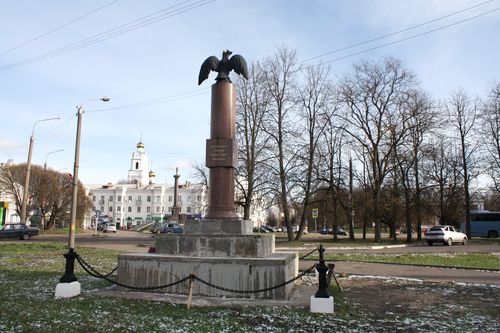 Преосвященный Христофор (Смирнов) окропил святой водой доску, положенную на фундамент. Памятник торжественно открыли 26 ноября 1913 года в присутствии Смоленского губернатора Д. Д. Кобеко и представителей Гренадерского Перновского полка. Памятник был устроен из серого гранита. Его венчал двуглавый орел с распростертыми крыльями. Клювом левой головы он терзал поверженное французское знамя, а правой смотрел на запад, куда побежали разбитые враги. На лицевой стороне памятника поместили герб города Вязьмы и увеличенные бронзовые копии лицевой и оборотной стороны медали в память Отечественной войны 1812 года. Осенью 1918 года по распоряжению богоборческой власти с памятника сняты орлы и все остальное литье. В начале 1920-х годов памятник полностью разобрали. Восстановили его лишь к октябрю 1959 года на новом месте.