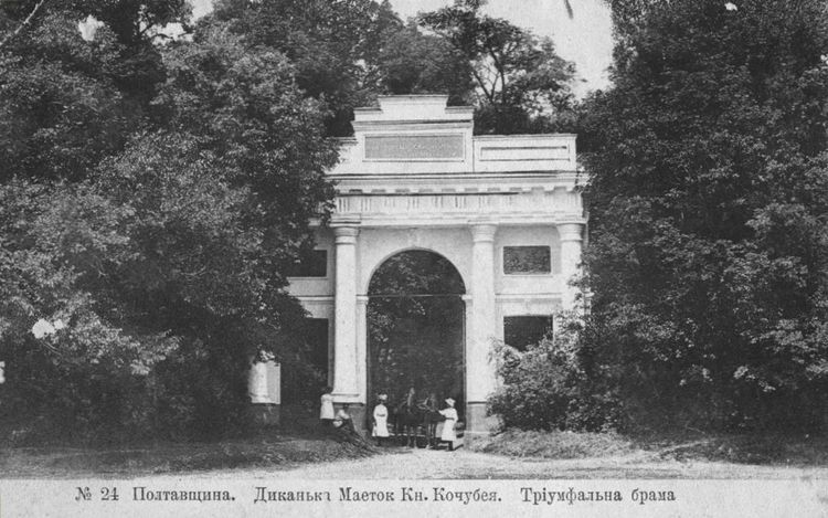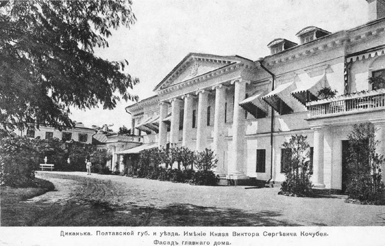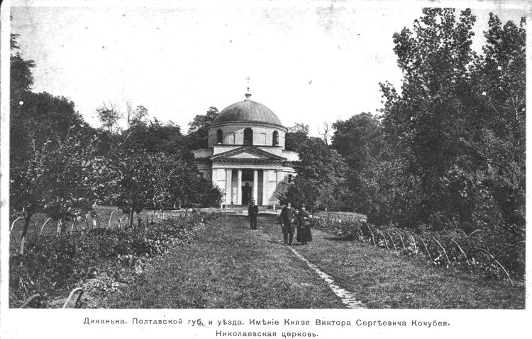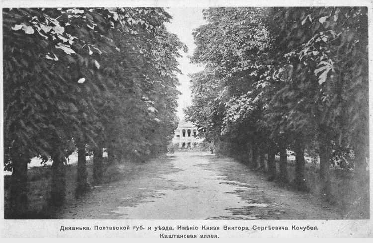 Усадьба Гоголя граничит с "Диканькой". Н. В. Гоголь постоянно бывал в "Диканьке", состоя в самых дружеских отношениях с семьею Кочубеев. "Диканька", как и ряд других русских усадеб, в то время была маленьким культурным центром, куда привлекало не только Гоголя, но и других писателей и интересных людей той эпохи. К сожалению, дом в усадьбе Гоголя, тот старый деревянный небольшой дом, в котором жил Н. В., недавно сломан. <...> Хранится в диканьском помещичьем доме ряд реликвий эпохи Петра Великого и шведской кампании и большая библиотека, богатая рукописями и книжными редкостями.