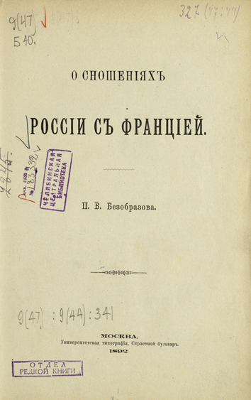 1. Безобразов, Павел Владимирович (1859–1918). О сношениях России с Францией / [Соч.] П.В. Безобразова. – Москва : Унив. тип., 1892. – [4], 465, II с.