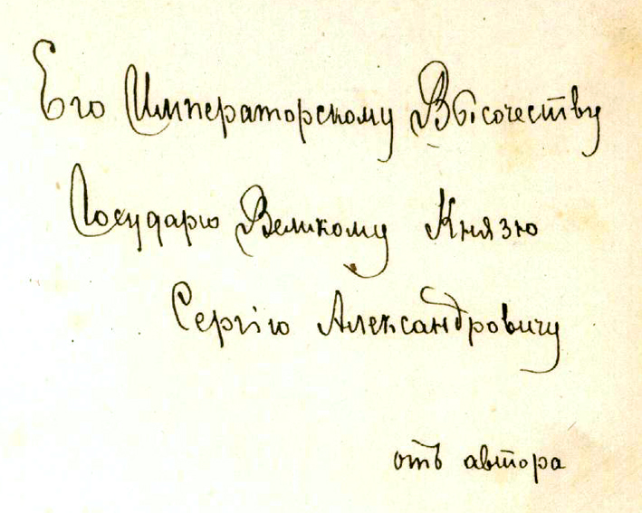 На шмуцтит. надпись: «Его Императорскому Высочеству Государю Великому Князю Сергiю Александровичу отъ автора».