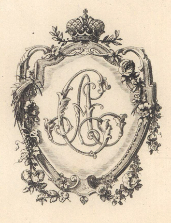 Вензельный книжный знак (экслибрис) в рокайльном картуше – фигурной рамке (в форме щита), увенчанной императорской короной и украшенной гирляндами из роз, в стиле рококо. В центре щита – сплетенные вместе две заглавные буквы имени и отчества «С» и «А». Книжный знак напечатан темно-коричневой краской на сатинированной бумаге. Выполнен в конце XIX в. Автор неизвестен.