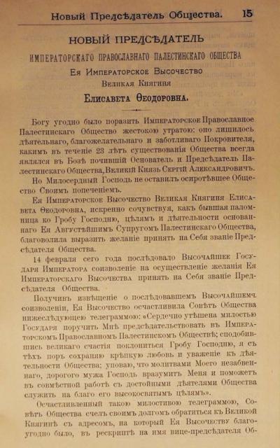 Ея Императорское Высочество Великая Княгиня Елисавета Феодоровна, искренне сочувствуя, как бывшая паломница ко Гробу Господню, целям и деятельности основанного Ея Августейшим Супругом Палестинского Общества, благоволила выразить желание принять на Себя звание Председателя Общества.