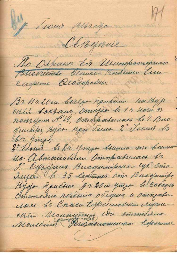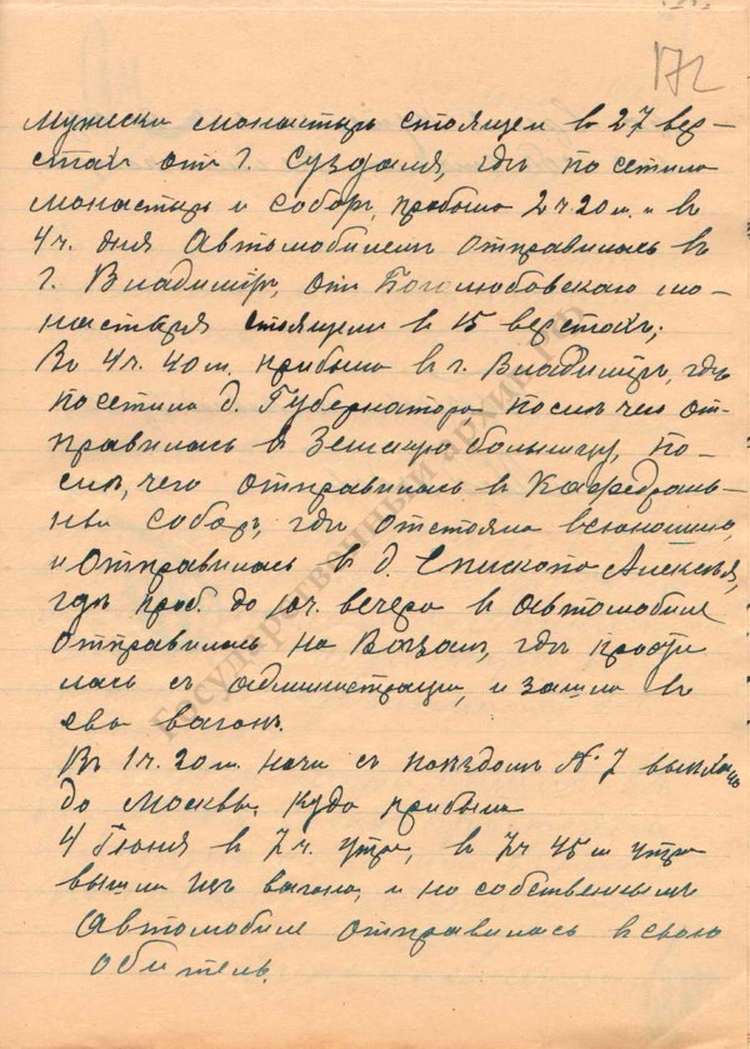 тырь, стоящий в 27-ми верстах от г[орода] Суздаля, где посетила монастырь и собор. Пробыла 2 ч[аса] 20 м[инут] и в 4 ч[аса] дня на автомобиле отправилась в г[ород] Владимир, от Боголюбского монастыря стоящего в 15-ти верстах. В 4 ч[аса] 40 м[инут] прибыла в г[ород] Владимир, где посетила дом губернатора, после чего отправилась в земскую больницу. После чего отправилась в кафедральный собор, где отстояла всенощную, и отправилась в дом епископа Алексия172, где пробыла до 10-ти часов вечера. В автомобиле отправилась на вокзал, где простилась с администрацией, и зашла в свой вагон. В один час 20 м[инут] ночи с поездом № 7 выехала до Москвы, куда прибыла 4-го июня в 7 часов утра. В 7 ч[асов] 45 м[инут] утра вышла из вагона и на собственном автомобиле отправилась в свою обитель. Во время путешествия по охране обстояло все благополучно. Бычков, Медведев.