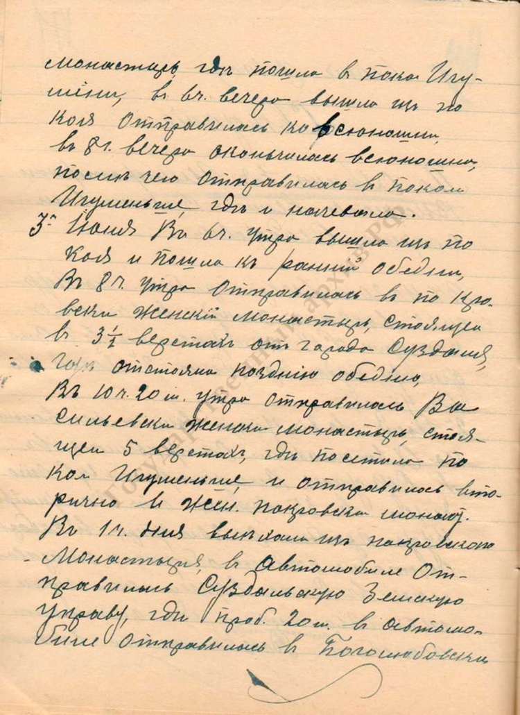 3-го июня в 6 ч[асов] утра вышла из покоя и пошла к ранней обедне. В 8 ч[асов] утра отправилась в Покровский женский монастырь170, стоящий в 3 верстах от города Суздаля, где отстояла позднюю обедню. В 10 ч[асов] 20 м[инут] утра отправилась в Васильевский женский монастырь171, стоящий в 5-ти верстах, где посетила покои игуменьи. И отправилась вторично в женский Покровский монастырь. В один час дня выехала из Покровского монастыря. В автомобиле отправилась в Суздальскую земскую управу, где пробыла 20 м[инут], и в автомобиле отправилась в Боголюбский мужской монас-