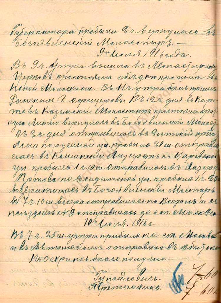 10-го июля 1916 г. В 7 ч[асов] 25 м[инут] утра прибыла на ст[анцию] Москва и в автомобиле отправилась в обитель. По охране благополучно. Гупойлович, Третьюхин.