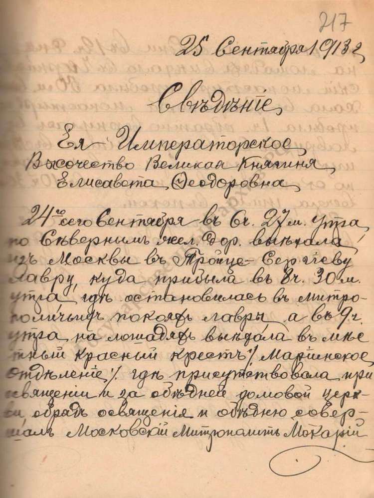 В 8 час[ов] 20 мин[ут] вечера с Ярославского вокзала Ее Императорское Высочество великая княгиня Елисавета Феодоровна отправилась с отходящим поездом № 16 на станцию Сергиево, где ожидали монастырские лошади. По выходе с поезда села в карету и отправилась в Сергиевский монастырь в покои митрополита. 25-го января Ее Императорское Высочество великая княгиня Елисавета Феодоровна в 9 часов утра вышла и отправилась в Троице-Сергиевский храм, по окончании обедни вышла, вернулась в покои. В два часа дня Ее Императорское Высочество великая княгиня Елисавета Феодоровна вышла и отправилась в книжный магазин при монастыре, где пробыла 25 минут. Вышла, села в карету и отправилась в Черниговский монастырь, где отстояла молебен, вышла. В карете вернулась в Сергиевские покои митрополита. В 6 час[ов] 10 м[инут] вечера вышла, в карете отправилась на станцию Сергиево, где с отходящим поездом № 39 в 6 час[ов] 30 мин[ут] вернулась в Москву. Нежданов, Фреер.