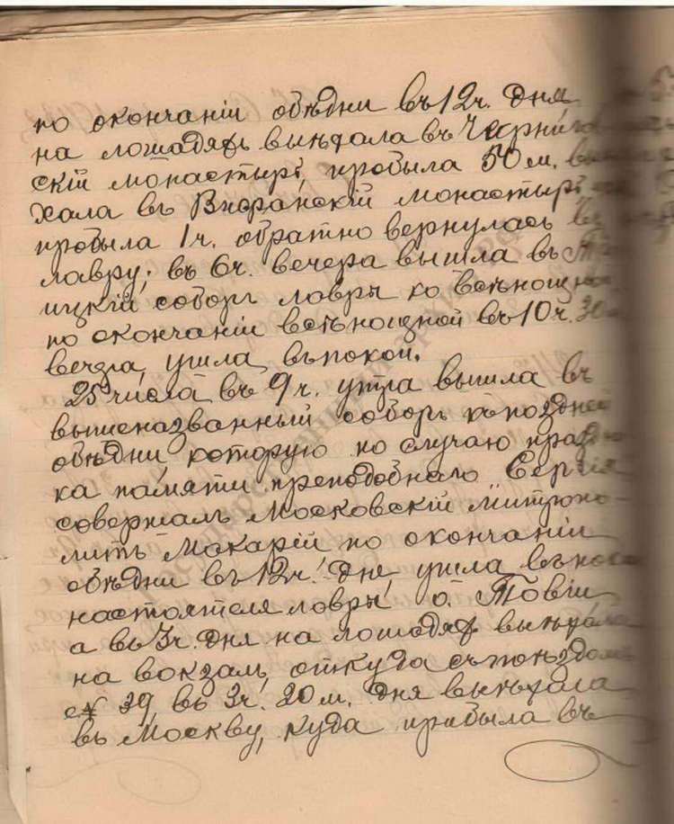 В 8 часов 30 мин[ут] утра приехала на Ярославский вокзал. С отходящим поездом № 32 отправилась до станции Сергиево. По прибытии на станцию вышла из вагона, отправилась на монастырских лошадях в Сергиевский монастырский покой, где пробыла 30 минут. Вышла, отправилась в Троицкий собор, где служили молебен, по окончании молебна вышла, отправилась в трапезную обедать. В 4 часа дня пришла в Троицкий собор, где служили вечерню. По окончании вечерни вернулась на лошадях в салон-вагон. В 6 часов 6 минут вечера с отходящим поездом отправилась до станции Москва. По выходе из вагона в автомобиле отправилась в обитель. Буров, Фреер.