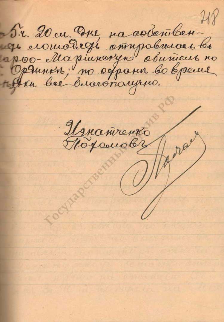 В 9 часов утра выехала из обители на освящение храма на Братском кладбище при селе Всехсвятском, пробыла до 12 час[ов] 45 мин[ут] дня, возвратилась в обитель. В 6 часов вечера вышла в Покровский храм обители к вечерне, по окончании вечерни слушала беседу, прочитанную Преосвященным Феодором Сергиево-Троицкого монастыря. По окончании беседы в 8 час[ов] 20 мин[ут] вечера вернулась в покои. В течение дня по охране благополучно. Гупайлович, Мордвинов.