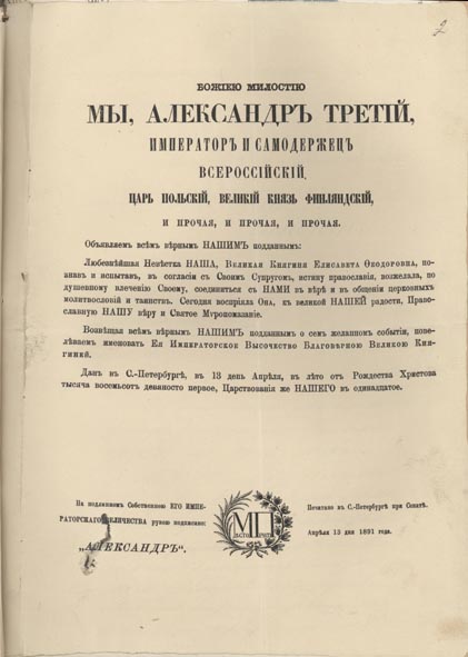 Манифест Александра III о принятии православной веры Великой Княгиней Елизаветой Федоровной. 1891 г.