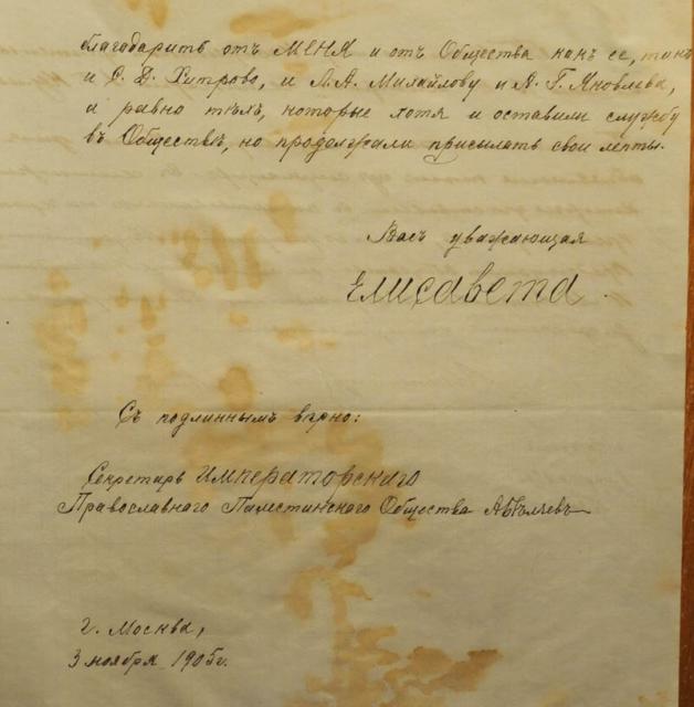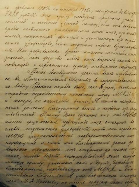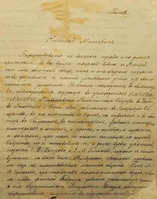 Такое единодушное участие всех трудившихся в Палестинском Обществе в пожертвованиях на войну Русского народа было, как Я знаю, особенно отрадно незабвенному покойному мужу МОЕМУ, и теперь, по окончании войны, Я считаю священным долгом благодарить всех и каждого из жертвователей. Прошу Вас сделать это от МОЕГО имени через особые извещения лиц, стоящих во главе отдельных учреждений, чтобы они передали МОЮ признательность подведомственным им служащим и чтобы эта благодарность дошла до каждого труженика от старшего до самого низшего, чтобы всякий пожертвовавший, хотя самую малую сумму, услышал как и другие, душевную благодарность, передаваемую от МЕНЯ и Палестинского Общества. Я уже благодарила телеграммой М. А. Черкасову; но теперь поручаю Вам сердечно благодарить от МЕНЯ и от Общества как ее, так и С. Д. Хитрово, и Л. А. Михайлову и А. Г. Яковлева, и равно тех, которые хотя и оставили службу в Обществе, но продолжали присылать свои лепты.