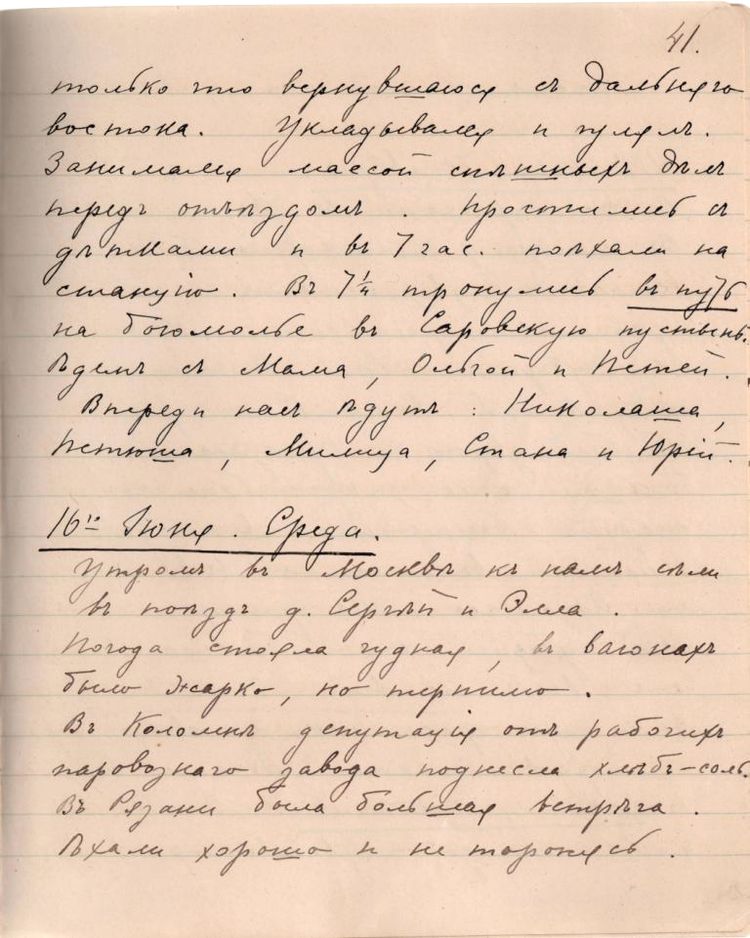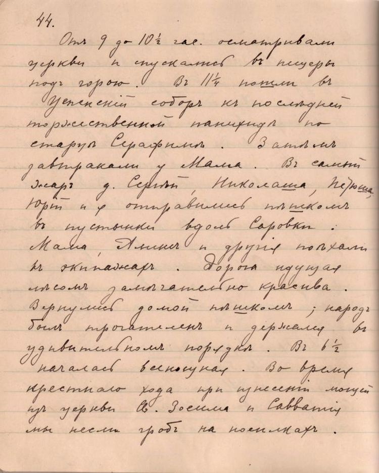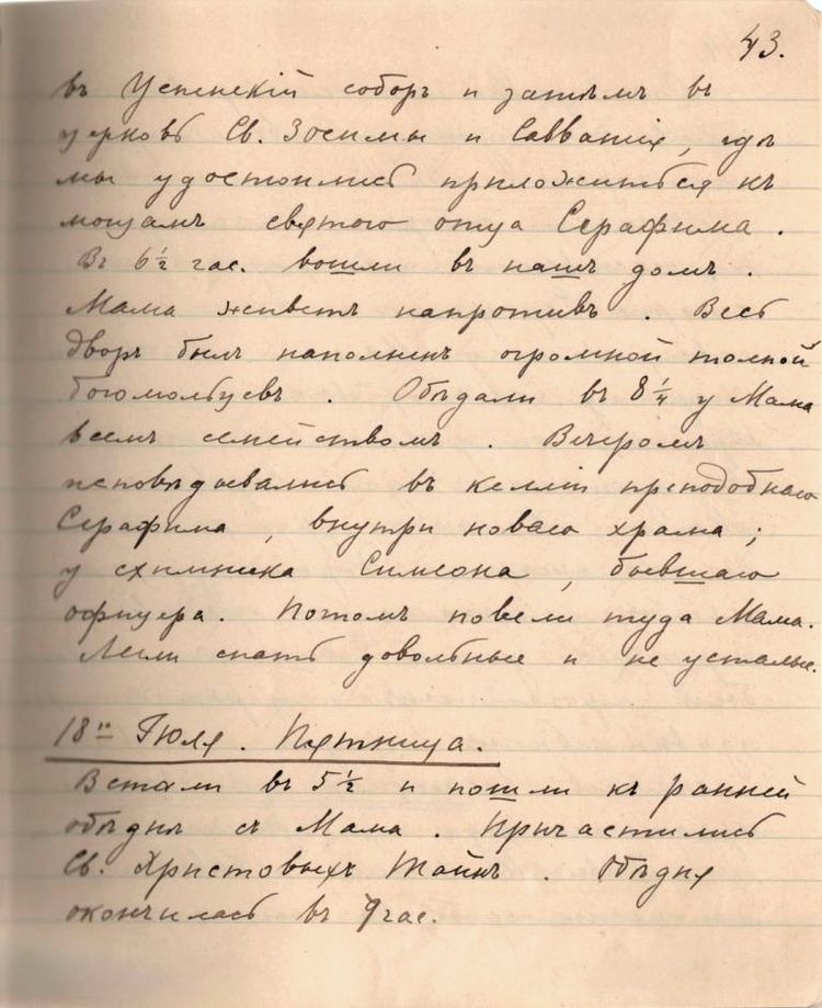 18 июля Его Высочество Сергей Александрович записал в своем дневнике, подведя итог дню: «Дивный, жаркий день. Встали в 6 ч. и пошли в собор к обедне, где приобщались Ники, Минни и Алекс. Пили чай с ними. Обходили весь монастырь. В 11 ч. соборная панихида по батюшке Серафиме – трогательно. В 2 ч. я пешком с Ники в обе пустыньки – народу сплошная стена. В общем 10 верст – остальные в экипажах. В ½7 ч. всенощная – Ники, я и братья несли носилки, на которых лежали мощи, из малой церкви в собор – умилительно, трогательно – народу 60 т. Прикладывались – ушли мы в ½10 ч. – устали, но чудесно» [18].