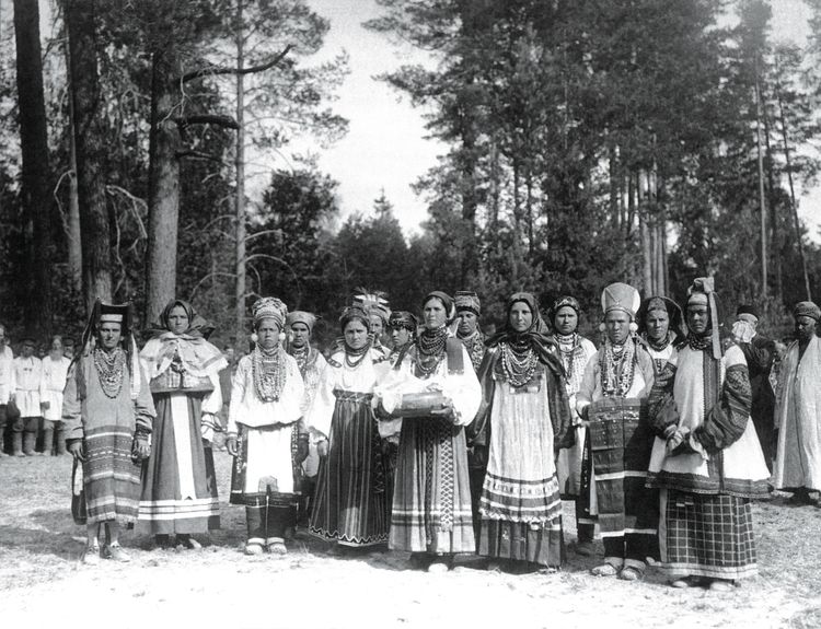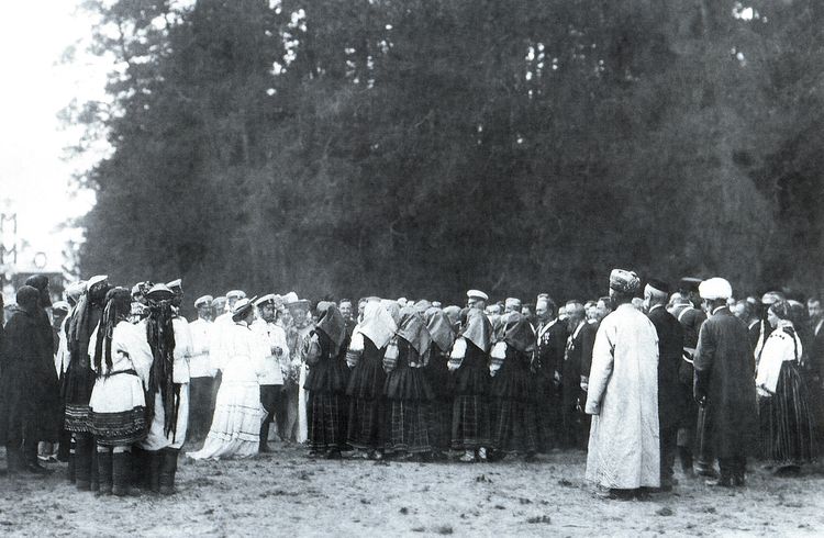Здесь собрались встретить Их Величеств все власти губернии, дамы и местные дворяне. Близ арки стали земские начальники, городские и волостные депутации, а за ними - широкий эффектный полукруг крестьянских депутаций. Эти депутации имели чрезвычайно оригинальный вид: Тамбовская губерния выслала сюда своих типичных коренных представительниц в их любопытных ярких колоритных костюмах. Сначала шли ряды красивых рослых великорусских крестьянок в шитых сарафанах и парчовых кокошниках с золотом. Далее тянулись ряды мордвы и мещеряков в их белых, тоже расшитых всевозможными узорами костюмах. Позади них, чтобы лучше оттенить красочность и эффектную пестроту их одежд, были поставлены однотонными рядами татары в зеленых, черных и белых халатах. Государь обошел дворян и земских начальников. Государыни Императрицы обходили земских начальников и каждого отдельно удостоили своим вниманием. Государь повелел старшинам передать всем крестьянам Тамбовской губернии благодарность Его Величества за хлеб-соль. Государь Император, Государыни Императрицы, Великие князья и княгини отбыли на лошадях в Саровскую пустынь; оглушительное "ура" сопровождало Царский кортеж. Долго не расходились крестьянские депутации, и долго гремели их радостные крики и летели вверх крестьянские шапки» [10].