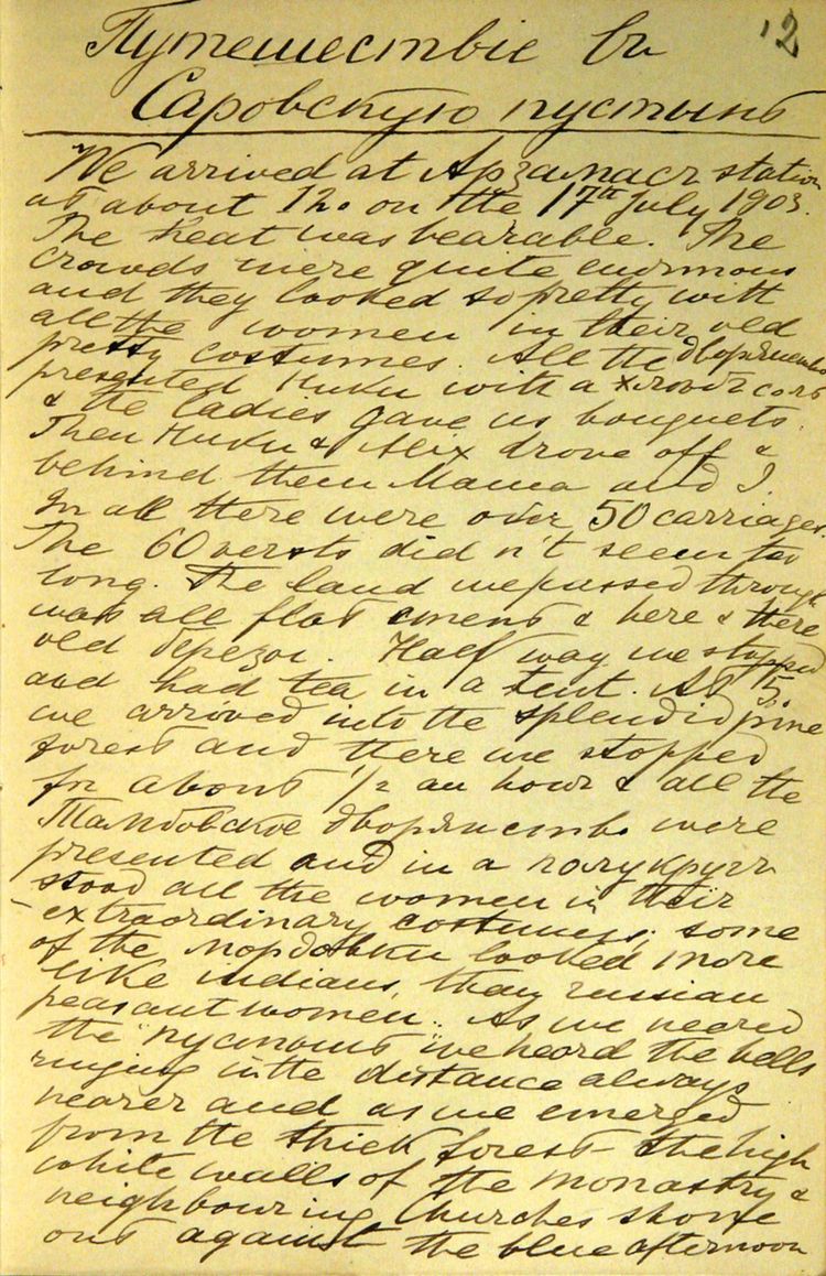 Запись в дневнике от 26 июля: «Продолжал описывать основательно и подробно Саровское паломничество» [57]. К великому сожалению пока ничего не известно об этом труде Великого князя.