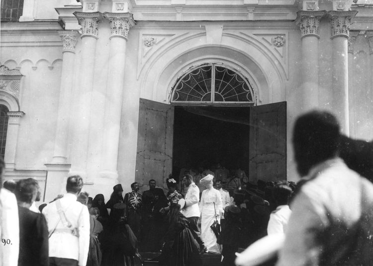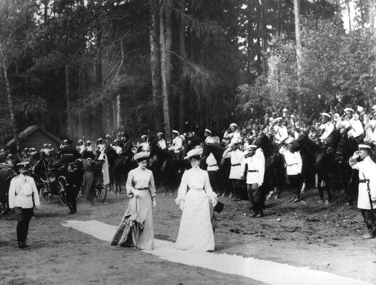Вдовствующая Императрица Мария Феодоровна разговаривает с монахинями, на втором плане виден Великий князь Сергея Александрович