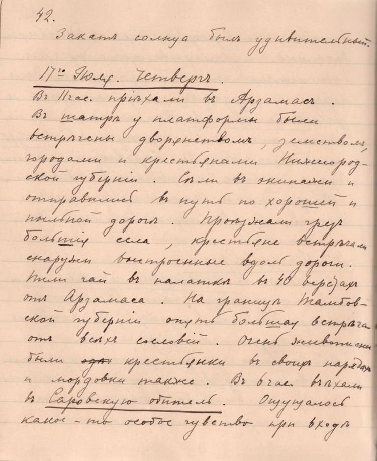 Вернувшись домой, Великий князь принимает решение описать Саровское паломничество: «Хочу описать подробно наше паломничество» [55]. Так в дневнике 25 июля Великий князь записал: «… начал писать в отдельные тетрадки описание нашего паломничества, занимался этим почти весь день» [56].