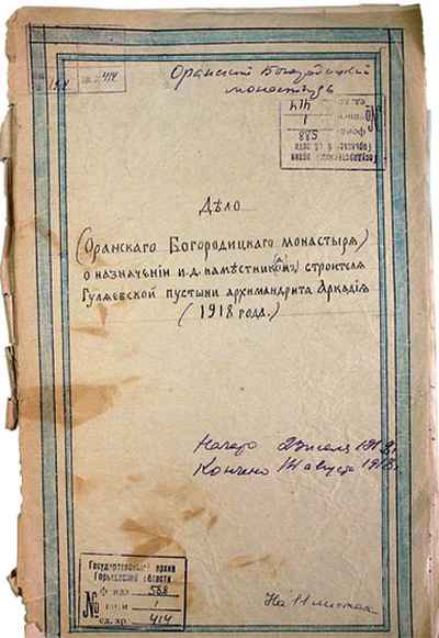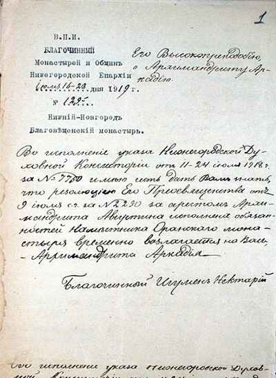 Указ о назначении вновь наместником Оранского монастыря архимандрита Аркадия 1919 г. ГУ ЦАНО