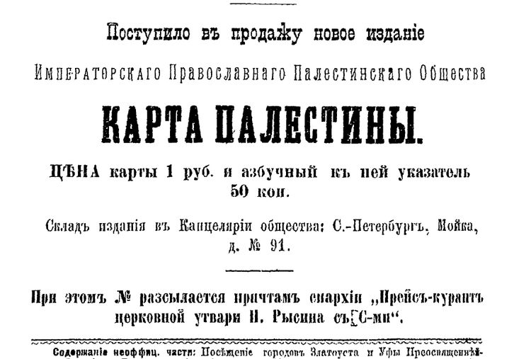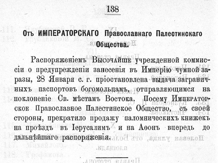 Совет Императорского православного палестинского общества считает долгом довести до сведения желающих отправится на богомолье в Иерусалим, что в настоящее время с наступлением в Палестине периода дождей, недостаток воды прекратился и потому препятствий к пребыванию в Иерусалиме не встречается.